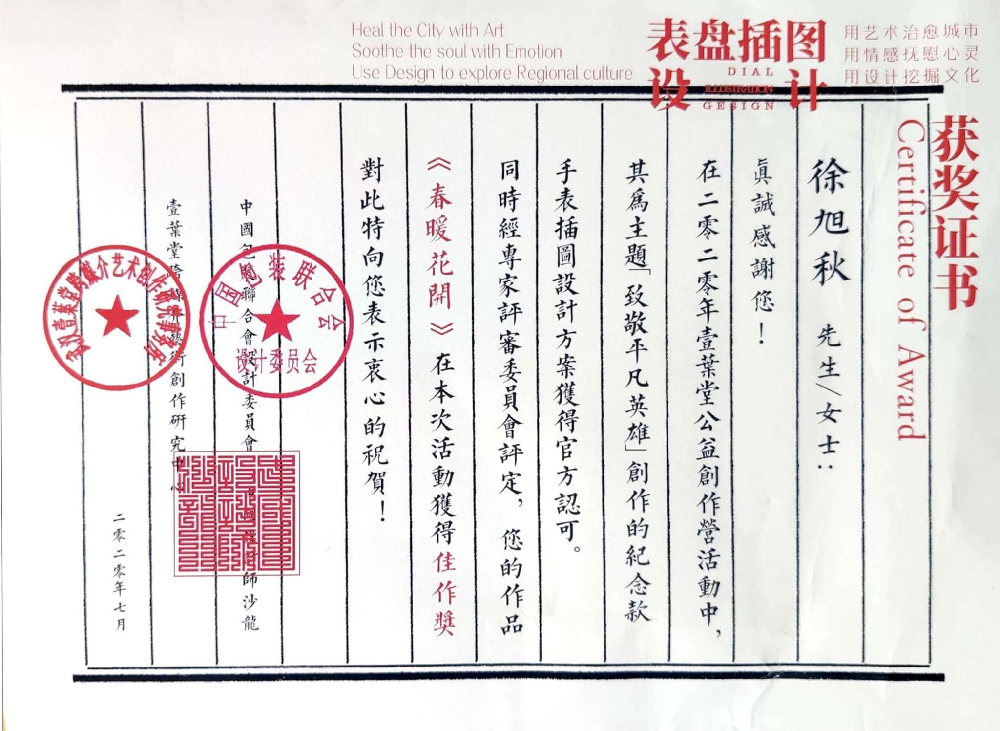 他不止步于理论知识的扩展,在通过日复一日的勤勉练习下,作品获得2019年江苏省老员工交通科普公益作品大赛二等奖、2020年壹葉堂公益创作营活动主题为致敬平凡英雄创作的纪念款手表插图设计佳作奖、“读绘经典”全国图像阅读与创作活动中作品进入“经典诠释能品”名单、“战疫情武汉能”2020抗击“新冠肺炎”公益宣传设计,全球征集活动入选奖、2019年第十一届全国老员工广告艺术大赛江苏赛区三等奖等四十余项省国级奖项。