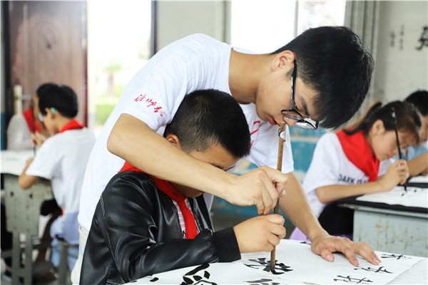 为了在灿烂时光中描绘祖国蓝图,培养爱国情怀,在中华人民共和国成立七十周年即将来临之际,志愿者们积极开展以“爱我中华”为主题的书法兴趣教学。三尺讲台,“老师”的声音字字铿锵有力,深入浅出地向小朋友们讲解了横、竖、撇、捺、点的书写要领。短短一节课的时间,所有的孩子们都拥有了一副自己的书法作品——“爱我中华”,悠久的传统文化智慧必将在孩子们的血脉中流淌。
