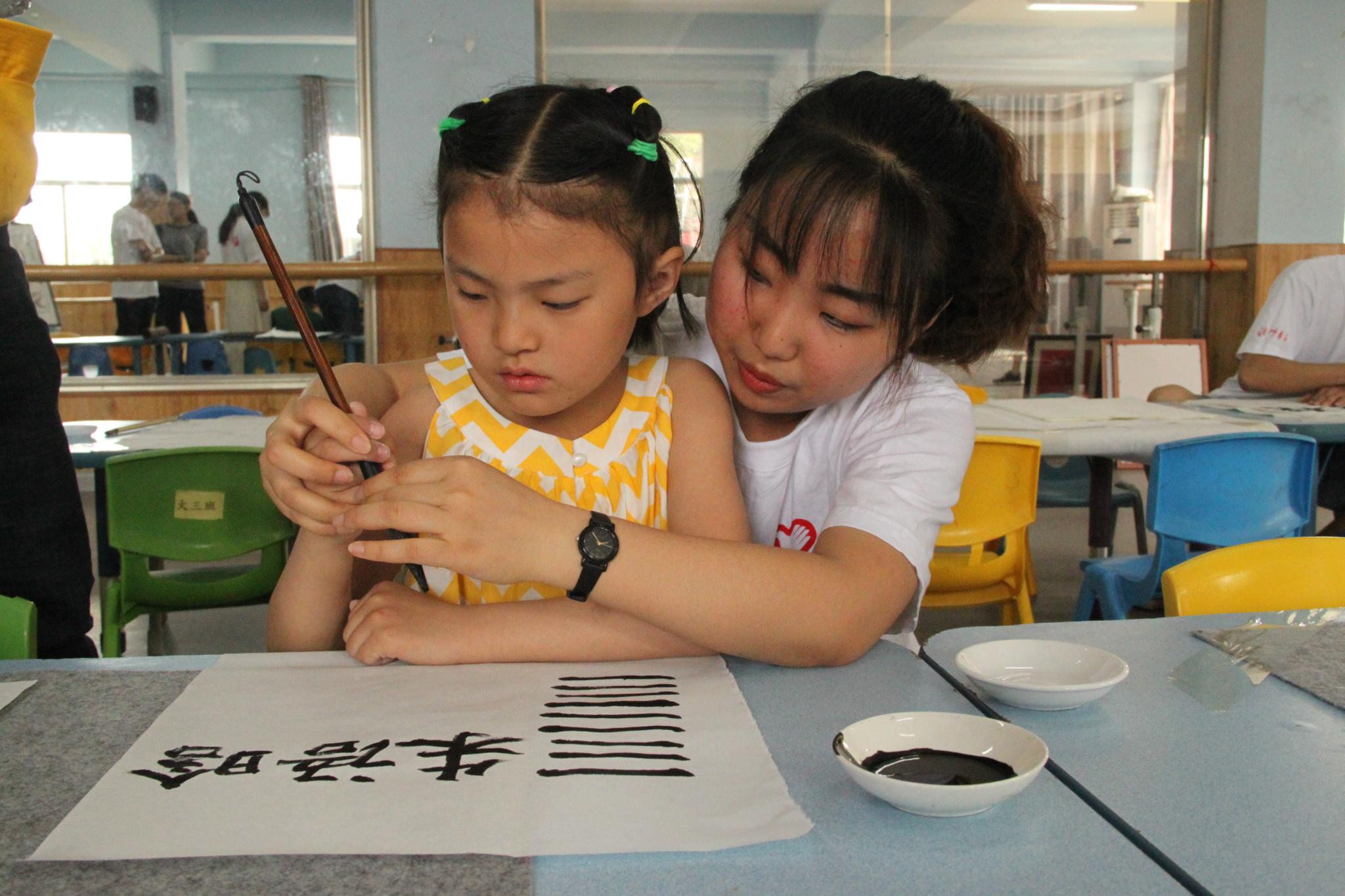 早晨八点的少年宫是一座欢乐的乐园,处处弥漫着节日的气息,欢乐荡漾,笑声回响。艺途博爱志愿团的成员早早布置场地等待小朋友们的到来,上午的体验课程是“独具匠心——书法体验课”,随着小朋友们的到来,志愿者们开始忙碌起来,向小朋友们一对一进行示范教学,讲述握笔、行笔,收笔的正确方法,语言幽默风趣,小孩子们认真聆听,家长们露着欣慰的笑容在一旁等待,随后志愿团成员握着小孩子们的手一起进行创作。