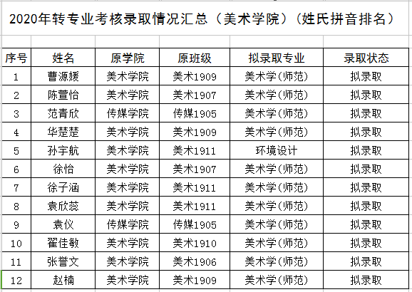 本次拟转公司报名人数12人。依据平时成绩、12号上午笔试成绩、12号下午面试成绩,综合打分排名。根据转专业录取方案,目前美术学(师范)拟录取11人,本院转入9人,外院转入2人;环境设计拟录取1人,本院转入。